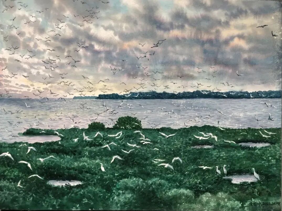 水彩畫《湛江紅樹林濕地風光》,作者陳樹中。“十四五”時期,廣東湛江聚力打造“紅樹林之城”。如今,湛江紅樹林濕地不僅是凈化海洋的“海上森林”,更是鳥的天堂、生物多樣性寶庫,被譽為“世界濕地生態恢復成功范例”。作品以此為著眼點,通過水天一色的空間布局和細膩的光影刻畫,描繪了一幅壯闊優美的生態畫卷。郁郁蔥蔥的紅樹林與波光粼粼的海面相輝映,在霞光中翩躚起舞的成群鷺鳥,不僅展現了生命的律動,更是對人與自然和諧共生理念的生動詮釋。