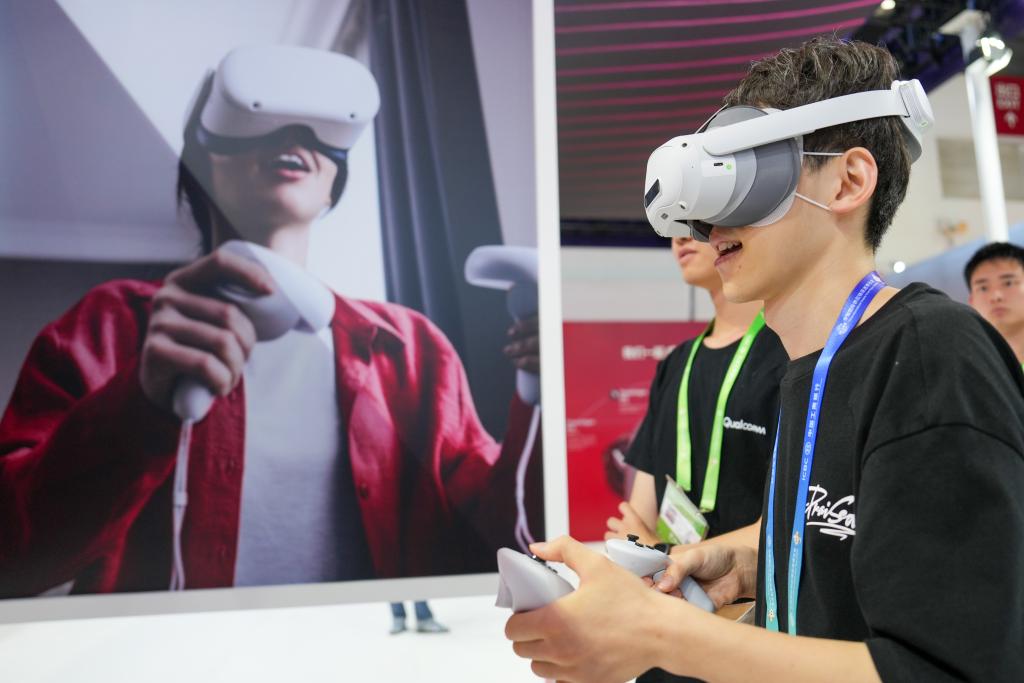 7月17日,參觀者在數字科技鏈展區高通展臺體驗搭載了高通公司芯片的產品。新華社記者鞠煥宗攝
