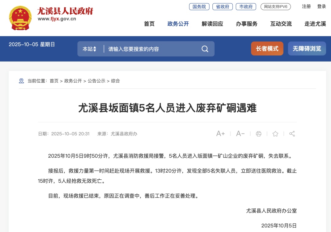 10月5日,據(jù)福建省三明市尤溪縣政府網(wǎng)站消息,2025年10月5日9時50分許,尤溪縣消防救援局接警,5名人員進(jìn)入坂面鎮(zhèn)一礦山企業(yè)的廢棄礦硐,失去聯(lián)系。