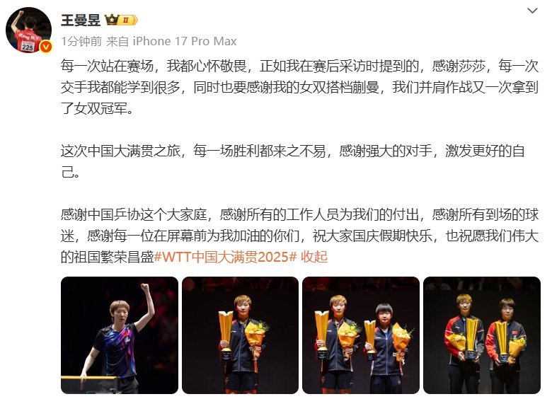 北京時間10月5日,WTT中國大滿貫女單決賽,王曼昱4-2力克孫穎莎,奪得冠軍,斬獲女雙、女單兩冠。孫穎莎收獲亞軍,本屆比賽收獲混雙冠軍和女單亞軍。