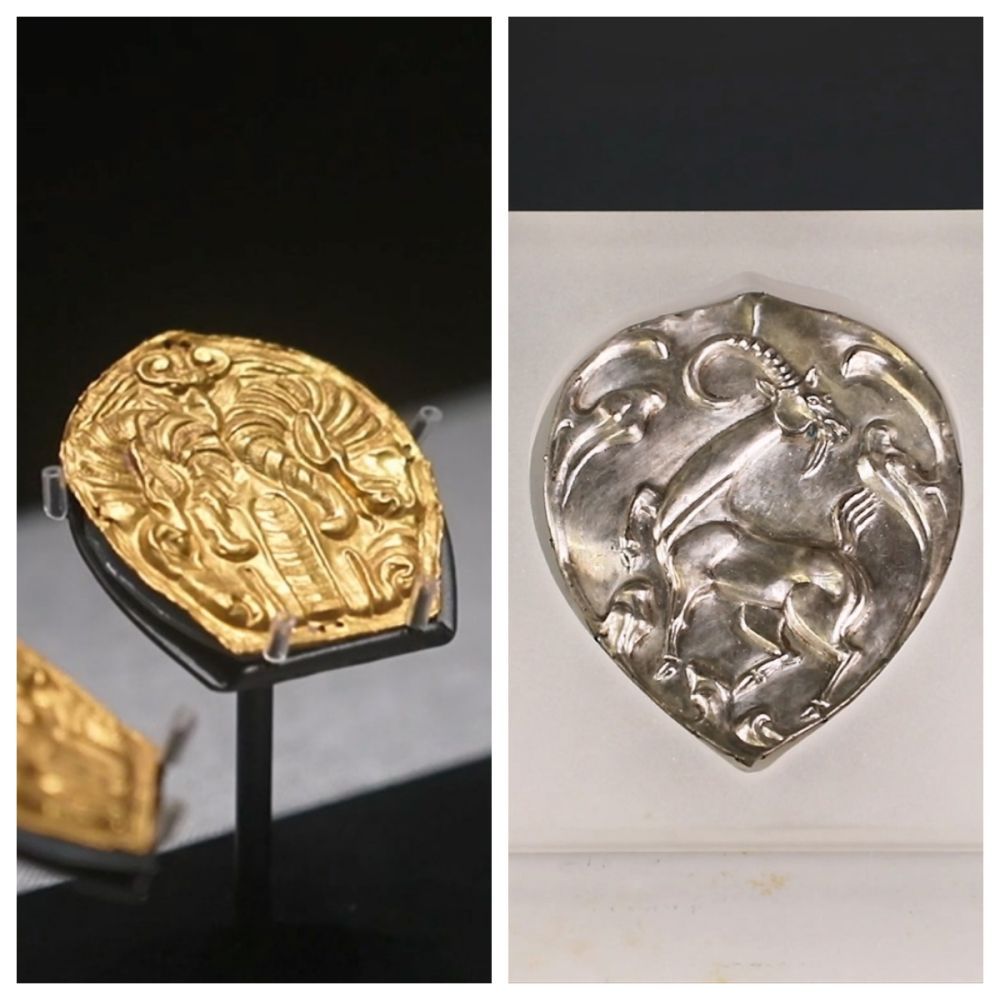 拼版圖片:左圖為羊頭紋杏形金飾片,右圖為羱羊銀馬珂。新華社記者 袁慧晶 攝