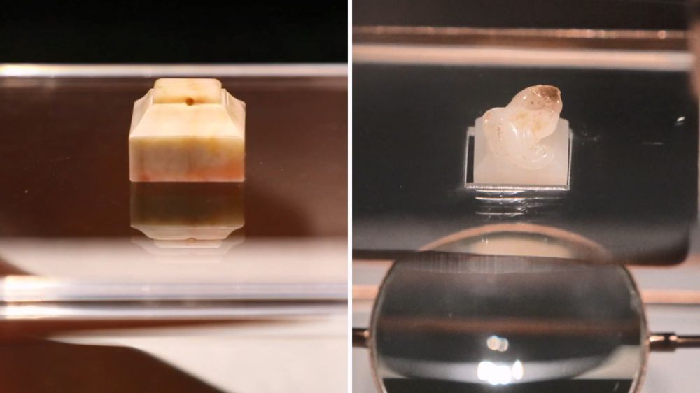 拼版圖片:左圖為西漢“趙眜”覆斗紐玉印(復制品),右圖為“劉賀”螭紐玉印。新華社記者 袁慧晶 攝