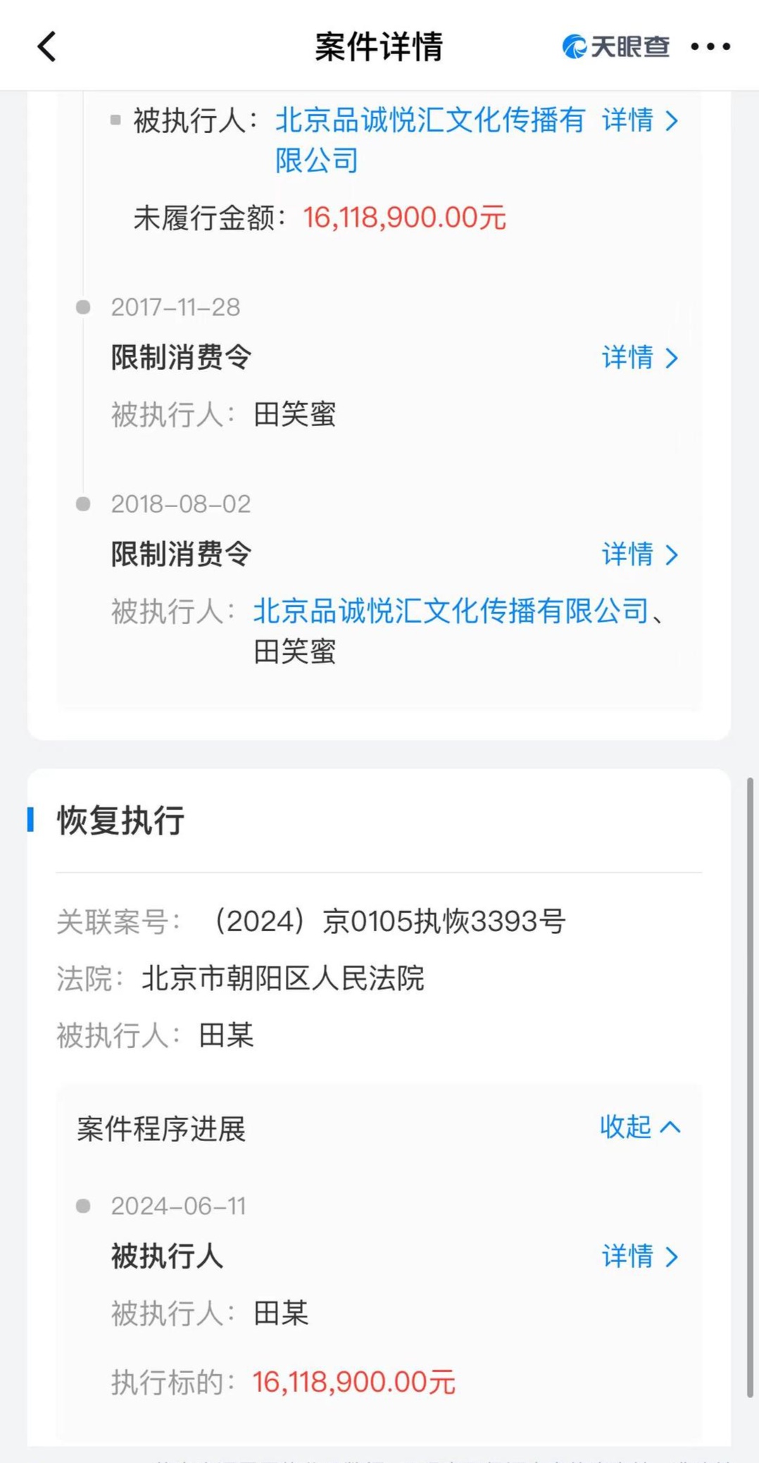 案件流程顯示,2016年7月,該案件首次執(zhí)行。此后,田笑蜜及其與朱丹共同經(jīng)營(yíng)的北京品誠(chéng)悅匯文化傳播有限公司被列為失信被執(zhí)行人,并被限制高消費(fèi),該案也被列為終本案件。