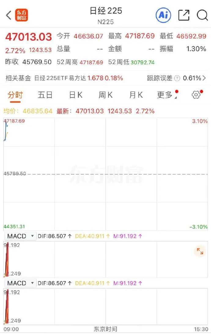 據(jù)財(cái)聯(lián)社,日經(jīng)225指數(shù)首次站上47000點(diǎn)。