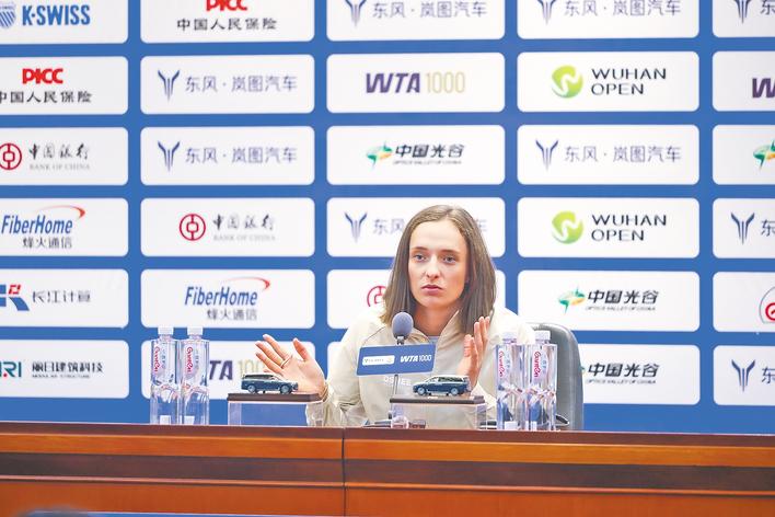 10月5日,斯瓦泰克在武網媒體見面會上發言。 (武網組委會供圖)