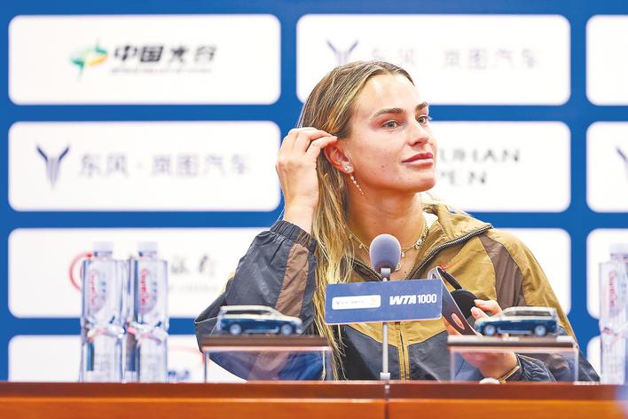 10月5日,武網媒體見面會上,薩巴倫卡對連續第四次奪冠顯得信心十足。(武網組委會供圖)