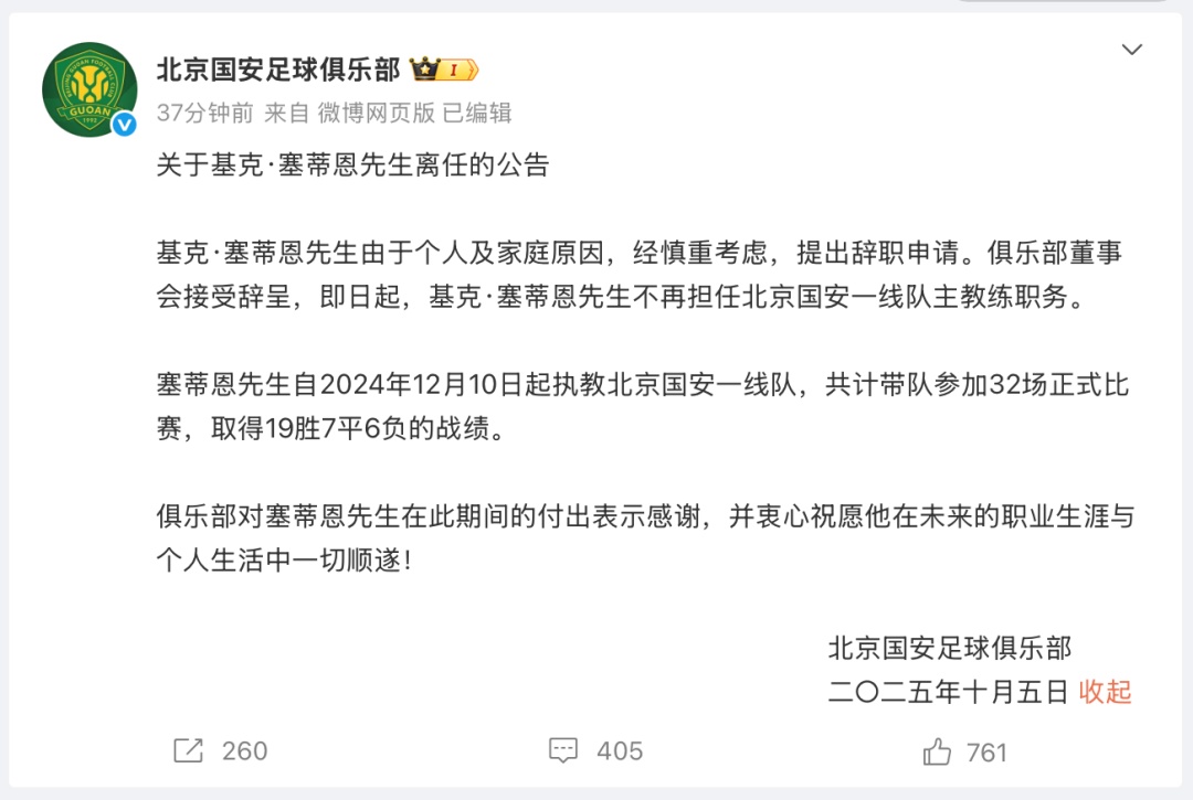 10月5日晚,@北京國安足球俱樂部 宣布基克·塞蒂恩辭職,不再擔任北京國安一線隊主教練職務。