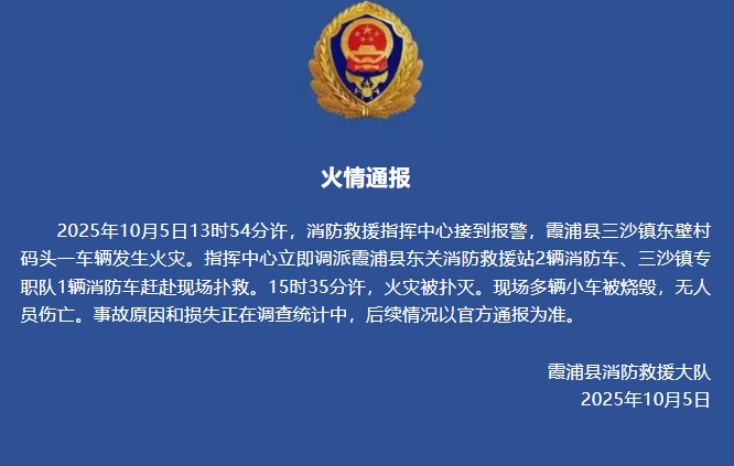 10月5日23:49,福建省寧德市霞浦縣消防救援大隊(duì)發(fā)布火情通報(bào)稱,當(dāng)天13時(shí)54分許,消防救援指揮中心接到報(bào)警,霞浦縣三沙鎮(zhèn)東壁村碼頭一車輛發(fā)生火災(zāi)。指揮中心立即調(diào)派霞浦縣東關(guān)消防救援站2輛消防車、三沙鎮(zhèn)專職隊(duì)1輛消防車趕赴現(xiàn)場(chǎng)撲救。15時(shí)35分許,火災(zāi)被撲滅?,F(xiàn)場(chǎng)多輛小車被燒毀,無(wú)人員傷亡。事故原因和損失正在調(diào)查統(tǒng)計(jì)中,后續(xù)情況以官方通報(bào)為準(zhǔn)。