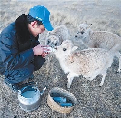 青海三江源國家公園管理局長江源園區可可西里管理處索南達杰保護站,巡山隊員給被救助的藏羚羊幼仔喂奶。