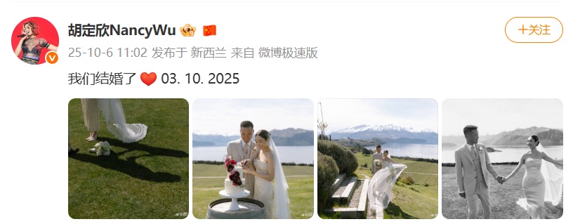 10月6日,演員胡定欣曬出婚紗照官宣結婚,“我們結婚了