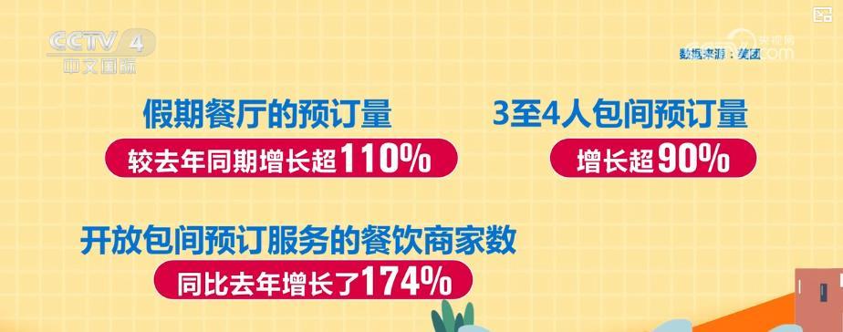 此外,團圓游與味蕾游交織成為今年假期“主旋律”,據美團餐廳預訂數據顯示,假期餐廳的預訂量較去年同期增長超110%,3至4人包間預訂量增長超90%,開放包間預訂服務的餐飲商家數同比去年增長了174%。上海、北京、南京、杭州等地今年假期餐飲堂食預訂熱度大幅上漲,假期餐廳預訂量增幅均在200%左右。