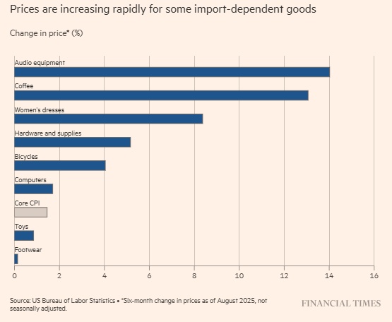報道稱,官方數據和企業聲明顯示,在企業清空庫存并將關稅成本轉嫁給消費者后,一系列依賴貿易的商品價格出現加速上漲。報道援引美國勞工統計局的數據指出,在截至8月的六個月時間內,音響設備價格上漲14%,女裝價格上漲8%,工具、五金用品上漲5%——這些商品大多依賴進口。