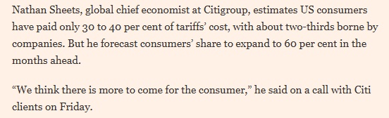 文章援引花旗集團全球首席經濟學家內森·希茨的觀點報道稱,目前美國消費者僅承擔了關稅成本的30%至40%,約三分之二的關稅成本由企業消化。但他預測,未來數月消費者的承擔比例將擴大至60%,“消費者還將面臨更多影響”。