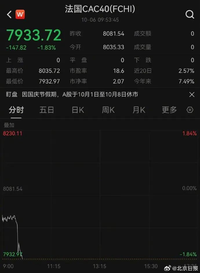 受此消息影響,法國(guó)股市直線跳水,截至發(fā)稿,法國(guó)CAC40指數(shù)跌1.83%。