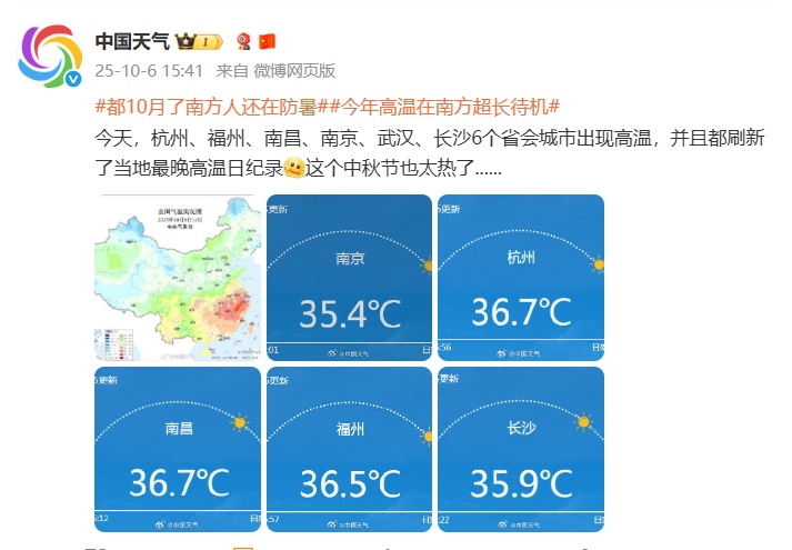 據@中國天氣, 今天,杭州、福州、南昌、南京、武漢、長沙6個省會城市出現高溫,并且都刷新了當地最晚高溫日紀錄。