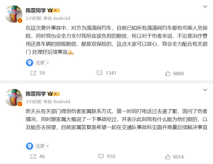 10月5日,事故中受損的比亞迪司機(jī)家屬在社交平臺(tái)上發(fā)文稱,“往后的日子會(huì)非常難,不知道該怎么過。”隨后,陳震轉(zhuǎn)發(fā)該條帖文并致歉稱,“發(fā)生這樣的意外事故,給您和您的家庭造成了這么大的傷害,實(shí)在對不起,我會(huì)全力配合有關(guān)部門,做好后續(xù)工作以及補(bǔ)償給您這邊造成的損失,再次跟您道歉。”