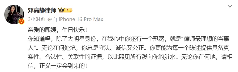 “親愛的熙媛,生日快樂!你知道嗎,除了大明星身份,在我心中你還有一個冠冕,就是‘律師最理想的當事人’。無論在何處境,你總是守法、誠信又公正。你更能為每一個陳述提供具備真實性、合法性、關聯性的證據,以此照見所有潑向你的臟水。無論你在何地,請相信,正義一定會到來的!”
