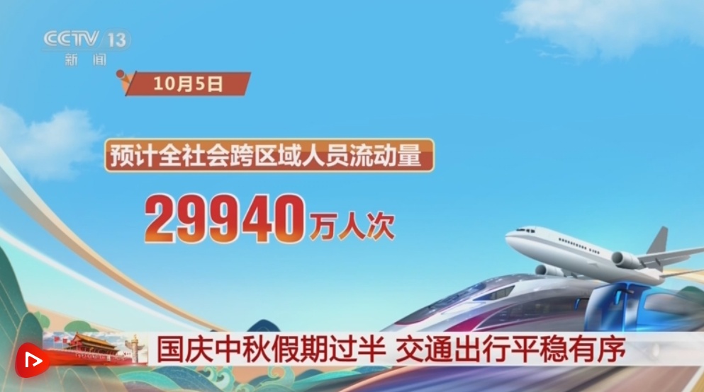央視網(wǎng)消息:記者從交通運(yùn)輸部了解到,10月5日預(yù)計(jì)全社會跨區(qū)域人員流動量超2.99億人次,同比增長6.3%。從9月29日到10月4日,鐵路累計(jì)發(fā)送旅客超過1億人次,運(yùn)輸安全平穩(wěn)有序。10月5日鐵路客流繼續(xù)保持高位運(yùn)行,中短途客流持續(xù)增多。鐵路客運(yùn)量預(yù)計(jì)1755萬人次。