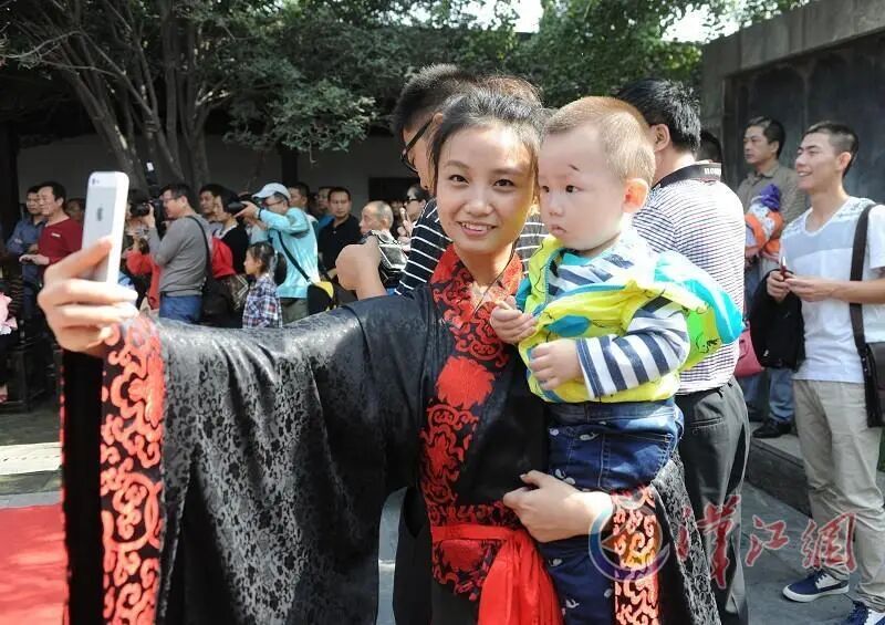 2014年10月3日,在米公祠景區(qū),一名穿漢服的女子和小游客合影。記者安富斌攝