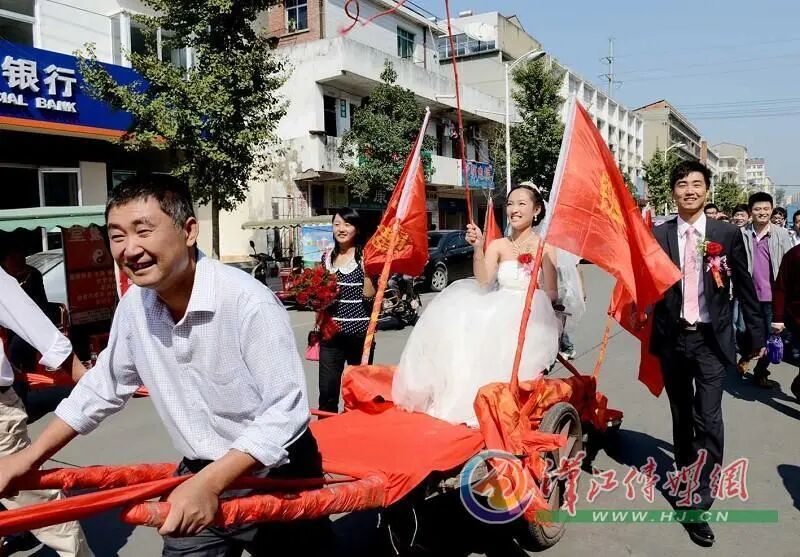 2012年“十一”期間,在南漳縣,一位新郎用板車迎娶新娘。