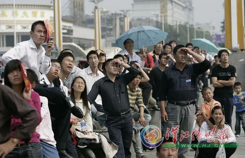 2009年10月1日上午,在襄樊火車站廣場,市民通過戶外電視大屏幕收看國慶閱兵式直播。