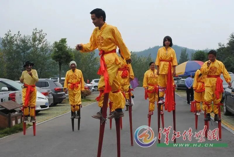 2012年10月4日,南漳縣東鞏鎮(zhèn)春秋寨景區(qū),民間藝人正在為游客表演高蹺。晏光輝攝