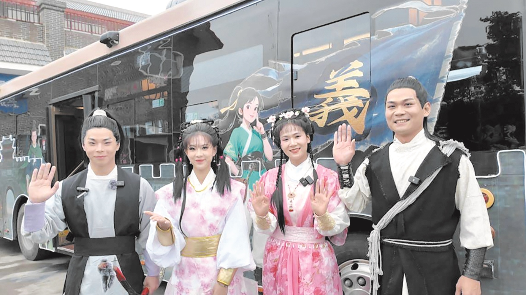 上午9點,“俠義襄陽” 主題公交從襄陽公交五公司駛出,車身繪著郭靖彎弓射雕的動漫彩繪,車窗懸掛的紅燈籠隨風輕擺,車廂內儼然一座移動武俠世界,旌旗高懸、花燈垂墜,木質雕窗上 “俠”“義” 二字隱約可見。