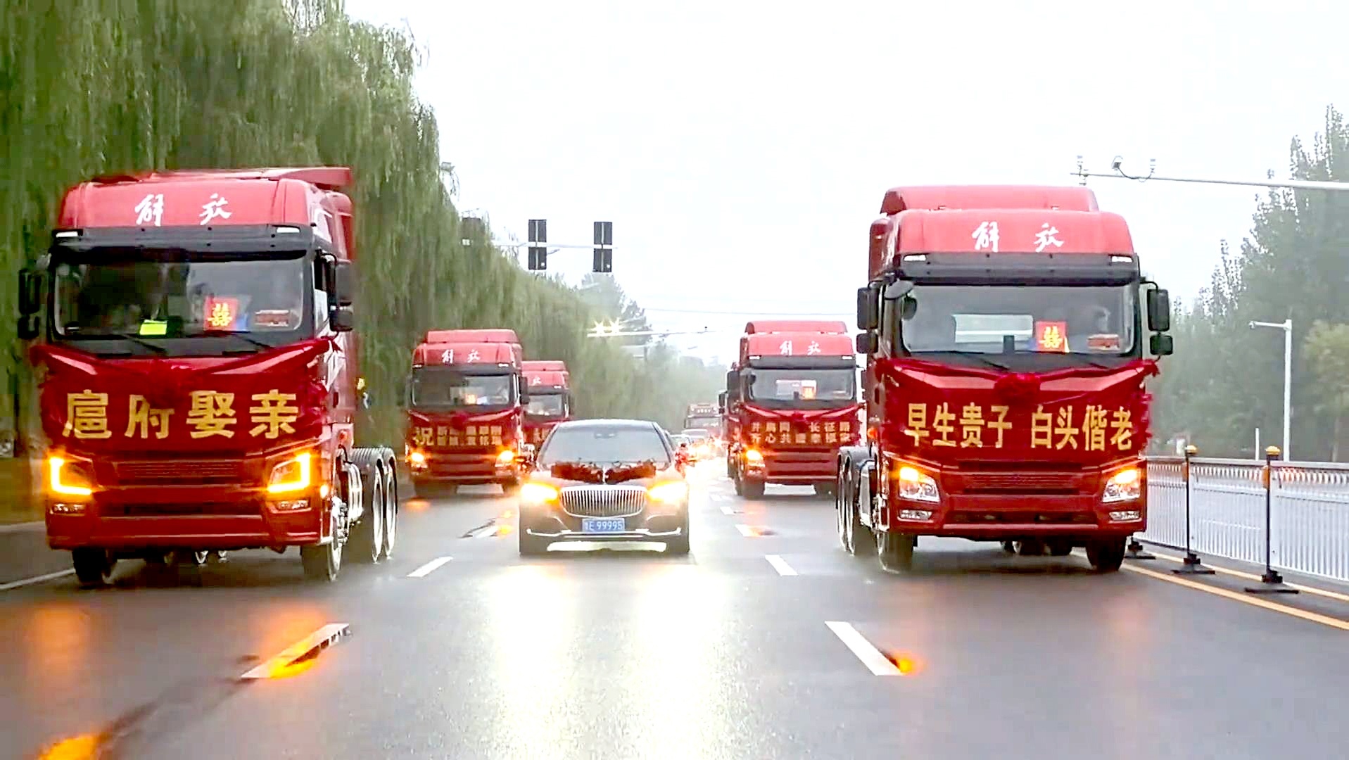 視頻畫面顯示,迎親車隊由一輛奔馳轎車打頭,6輛紅色解放牌重卡分成2列尾隨其后,卡車車頭張貼著“扈府娶親”“早生貴子 白頭偕老”“并肩同心長征路 齊心共譜幸福家”等祝福標語。