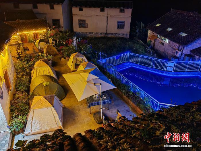 10月3日,游客在貴州省貞豐縣平街鄉花江村村民林國權的民宿院子內搭帳篷。(受訪者供圖)