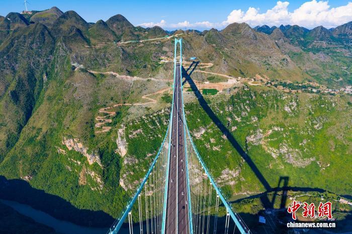 該橋主橋跨徑居山區橋梁跨徑世界第一、橋梁高度居世界第一。眾多游客慕名前來,或踏上透明玻璃步道體驗“云端漫步”,或在大橋觀景平臺、周邊村寨尋找最佳角度,與這座“橫豎都是世界第一”的大橋合影留念。