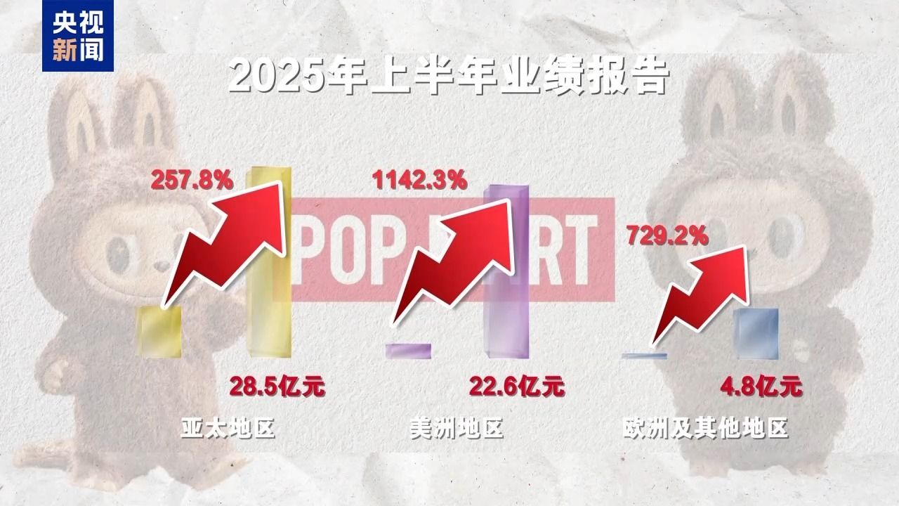 根據(jù)泡泡瑪特8月發(fā)布的2025年上半年業(yè)績報告,亞太地區(qū)營收28.5億元,同比增長257.8%;美洲地區(qū)營收22.6億元,同比增長1142.3%;歐洲及其他地區(qū)營收4.8億元,同比增長729.2%。