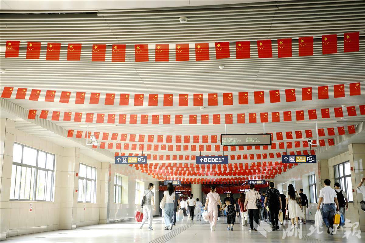 ▲武漢地鐵懸掛國旗裝點車站,營造出濃厚的節日氣氛。湖北日報通訊員袁永華 攝