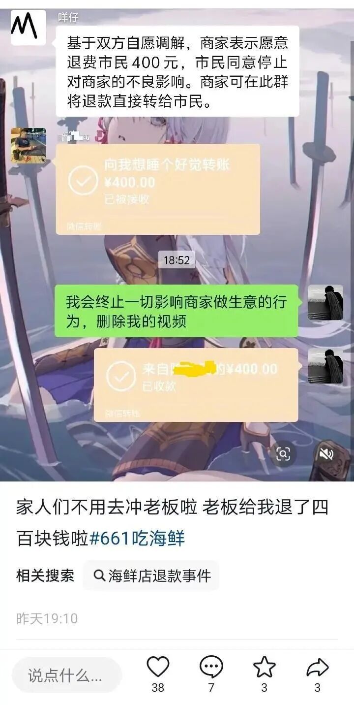 10月7日,記者聯系當事游客楊先生和餐廳方,均未得到此事的進一步回應。記者注意到,楊先生已刪除此前投訴此事的視頻,并于6日晚發布了一張微信群截圖,顯示雙方疑似已達成調解,一個微信名叫陳某的人向他退費400元。