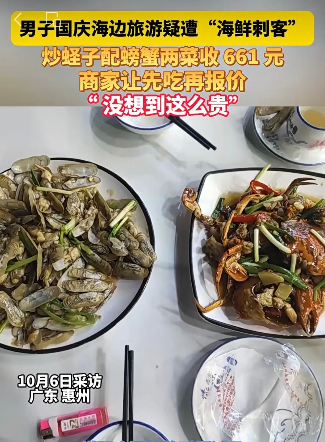 據媒體此前報道,10月6日,有網友在社交平臺發文,國慶到廣東惠州旅游,在一海邊餐廳吃飯時,點了炒蟶子和螃蟹兩個菜總價661元,懷疑自己遇到“海鮮刺客”。