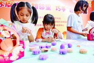 10月5日,在江蘇省無錫經開區太湖街道方廟社區舉辦的迎中秋主題活動上,小朋友體驗制作月餅。新華社發