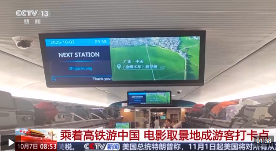 據了解,為持續推動“電影+”業態創新,國慶期間,在全國3000多個鐵路客運車站、4200多組動車組列車的車廂電視上,集中播放《跟著電影去旅游》等影旅主題推介視頻,不僅展示熱門電影取景地,還聯動多條鐵路旅游專線提供出行指引,邀請旅客體驗“鐵路+電影”的出行新方式。