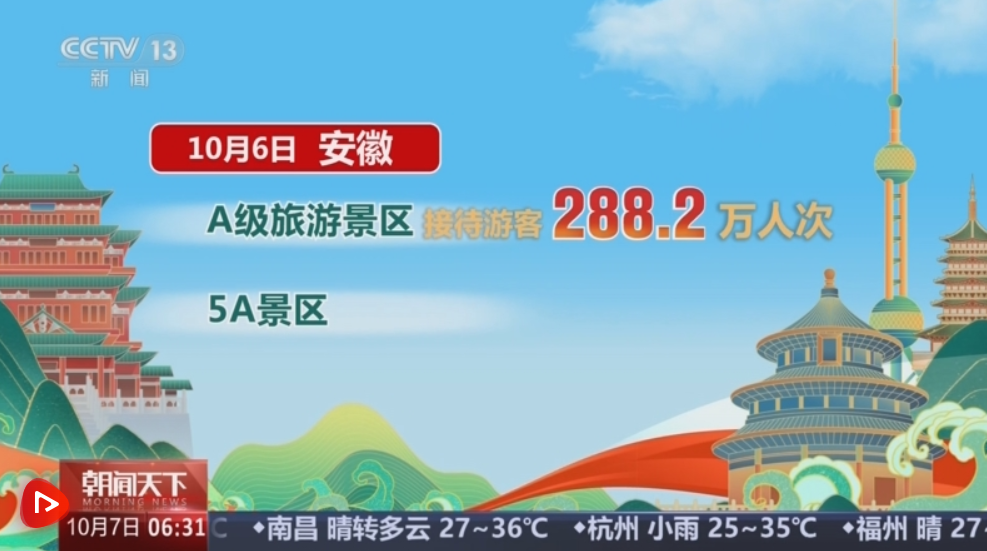 假期第六天,安徽A級旅游景區接待游客288.2萬人次。其中,5A景區接待游客32.7萬人次,同比增長8.5%。
