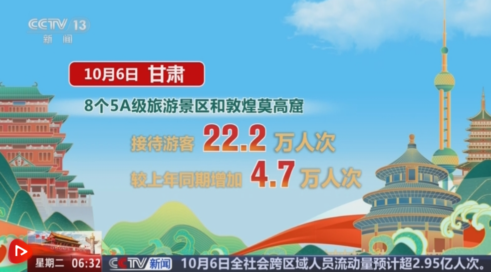 記者從甘肅省文化和旅游廳了解到,10月6日,恰逢中秋佳節,游客出行熱情不減。甘肅預計接待游客390萬人次,實現旅游花費24.2億元,兩項數據均同比增長超過8%。