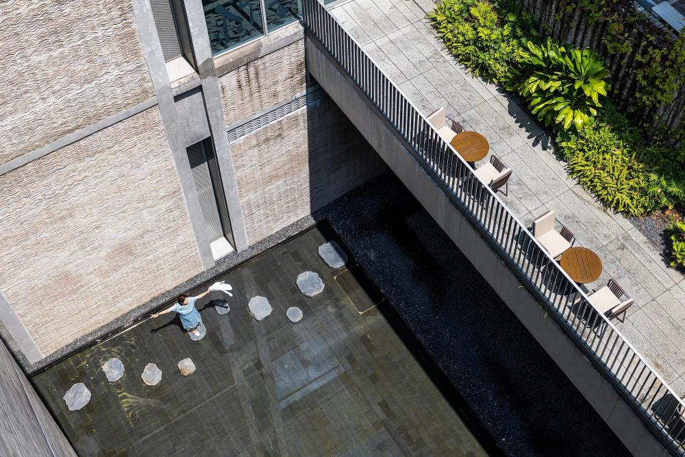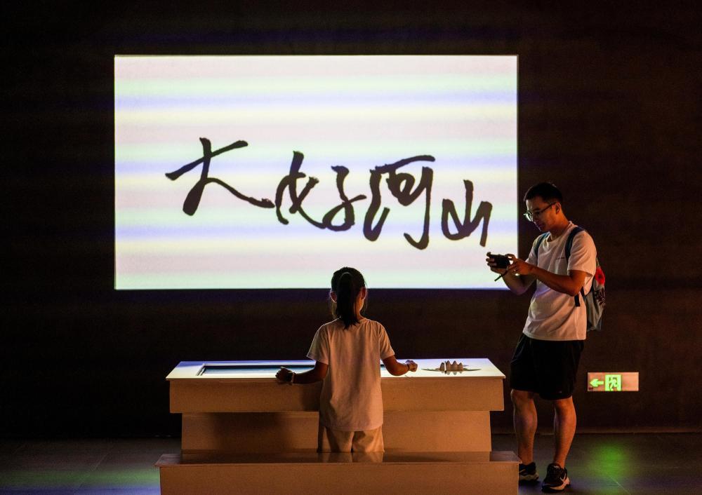 9月13日,游客帶孩子在塱頭村的春陽臺藝文中心體驗書法互動裝置。