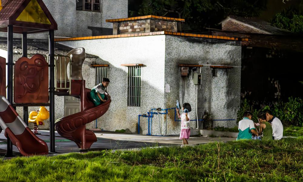 9月12日,孩子們在塱頭村新村的公共游樂設施玩耍。