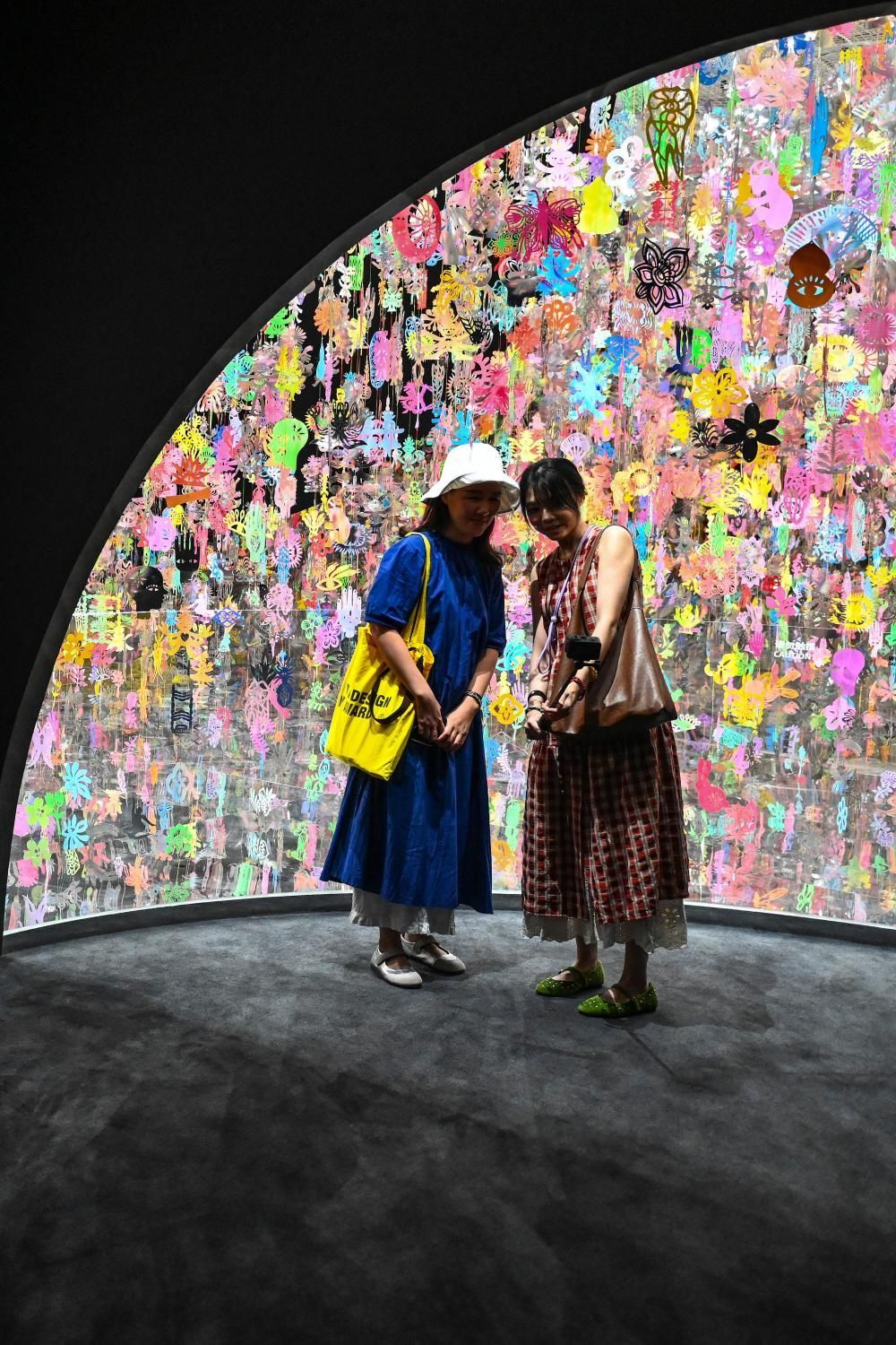 9月12日,游客在塱頭村春陽臺藝文中心的藝術展覽打卡拍照。