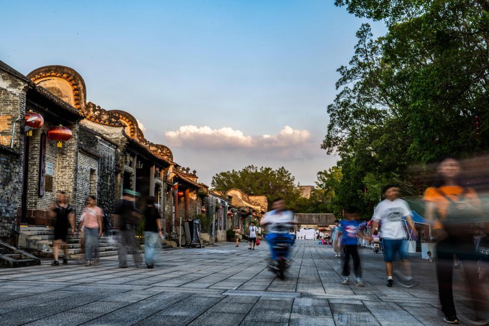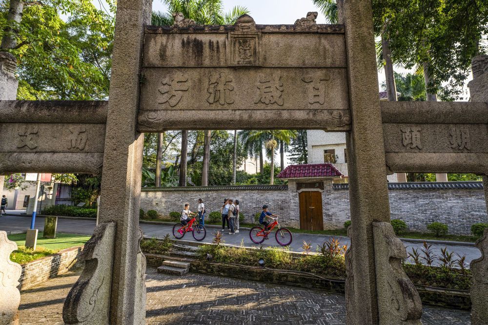 9月13日,孩子們騎車經過塱頭村的升平人瑞牌坊。畫面中部遠處白色建筑是春陽臺藝文中心。