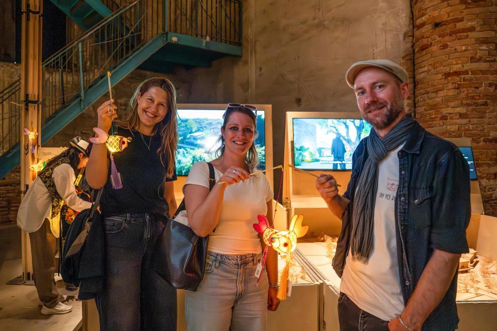 在意大利威尼斯,參觀者在第19屆威尼斯國際建筑雙年展主題館“塱頭實驗”展區展示現場領取的嶺南魚燈紀念品(2025年5月10日攝)。