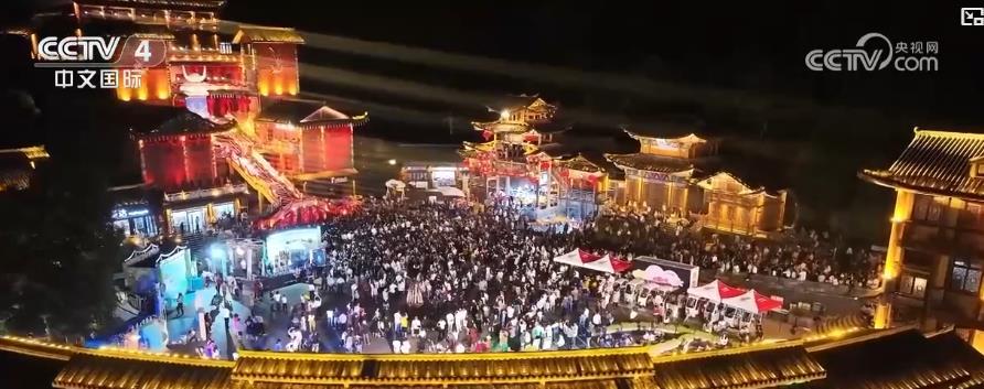 夜幕降臨,重慶市酉陽土家族苗族自治縣的桃花源景區燈火璀璨,游人如織。古樸的吊腳樓綴滿燈光,游客們或漫步在青石板街欣賞夜景,或圍成圓圈跳起舞蹈,現場歡聲笑語不斷。隨著雜技、川劇變臉等節目上演,現場氣氛逐漸升溫。演員們不時走入觀眾席與游客互動,將中秋的氛圍推向高潮。