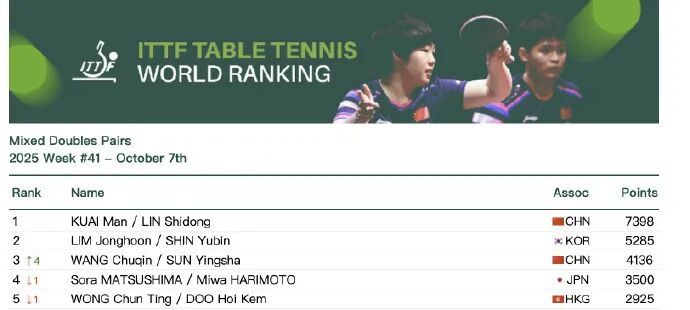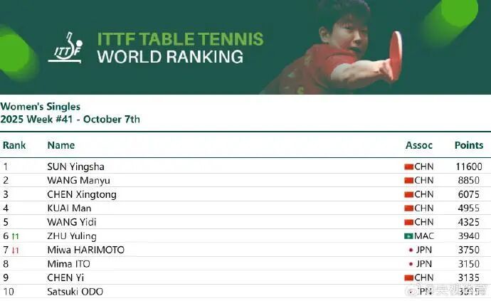 “萬分女王”孫穎莎繼續(xù)領(lǐng)跑世界排名