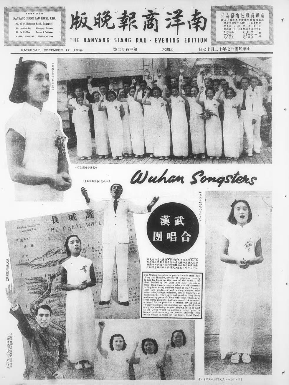 在時(shí)任中共長江局負(fù)責(zé)人董必武的幫助下,1938年9月,武漢合唱團(tuán)一行28人從武漢啟程,途經(jīng)廣州、澳門、香港,于12月抵達(dá)新加坡。在愛國僑領(lǐng)陳嘉庚的支持下,12月18日晚,武漢合唱團(tuán)在新加坡大世界游藝場(chǎng)進(jìn)行首場(chǎng)試演。