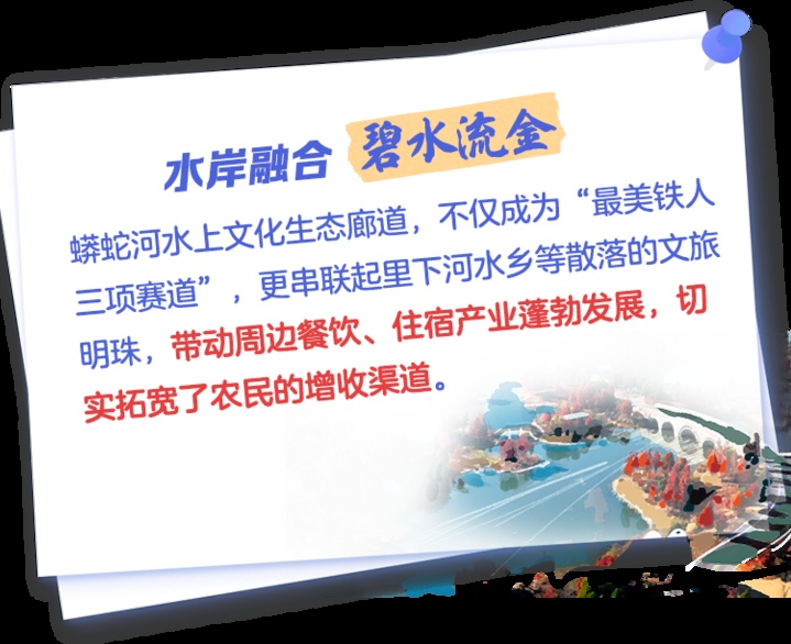站在蟒蛇河的游船上眺望,水波流轉處,大縱湖的飛鳥正掠過天際,涇口村的船隊已駛向深藍。這條母親河的變遷,恰似一堂流淌在城鄉肌理間的立體生態公開課——它以“退漁還湖”的決斷講述敬畏,用“水岸融合”的智慧詮釋共生,更借“向海圖強”的膽魄書寫未來。