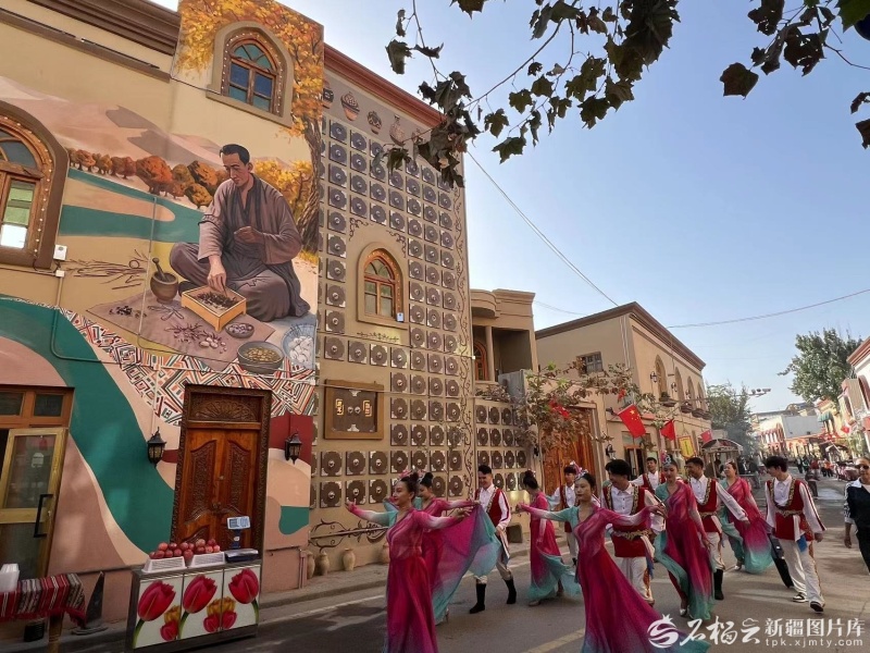 在墨玉縣,老城景區的“墻上博物館”成為游客感受文化、寄托情思的好去處。游客陳南方與愛人特意來到老街,在“在這里,向祖國致敬”的打卡點前合影留念。“早聽說墨玉是絲路南道的重要節點,這面墻把古商隊穿越沙漠的場景畫活了,再想想現在的發展,真有種‘古今對話’的感覺!”來自烏魯木齊市的游客張斌站在《絲路駝印》墻前,一邊拍照一邊感慨。