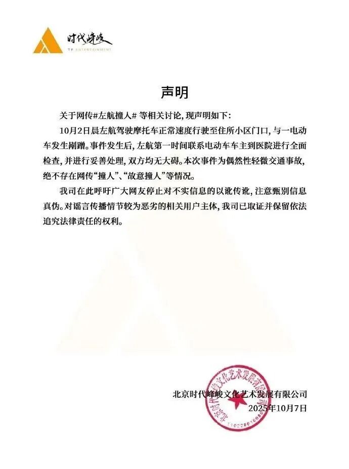 10月7日晚,北京時代峰峻文化藝術(shù)發(fā)展有限公司針對網(wǎng)傳“左航撞人”等相關(guān)討論,發(fā)布聲明: