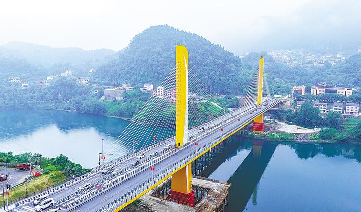 10月6日,鳥瞰已通車的清江市政特大橋,只見橋上車流不息,行車井然有序。據了解,該橋自今年7月1日通車以來,極大地緩解了長陽縣城內的交通壓力。雙節期間,盡管車流增長,但長陽縣城及周邊沒有出現嚴重堵車現象。 (湖北日報全媒記者 朱熙勇 攝)